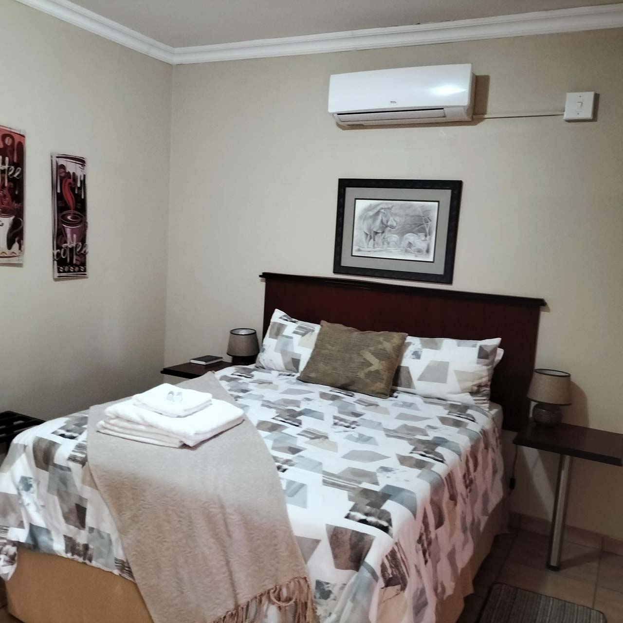 Coffee@home is 'n bekoorlike gastehuis in Prieska, sowat 240 km suidwes van Kimberley. Prieska is op die N10-roete tussen Namibië en die Oos-Kaap. Die gastehuis bied drie en suite-kamers wat na verskillende koffietipes vernoem is, almal met privaat ingange. Die kamers is toegerus met koningingrootte-beddens, storte, lugversorging, tee- en koffiemaakgeriewe, wifi, haardroërs en TV's met vol DStv-toegang. Ons gaste kan in 'n pragtige privaat deel van die tuin ontspan terwyl hulle die sing van die voëls geniet.