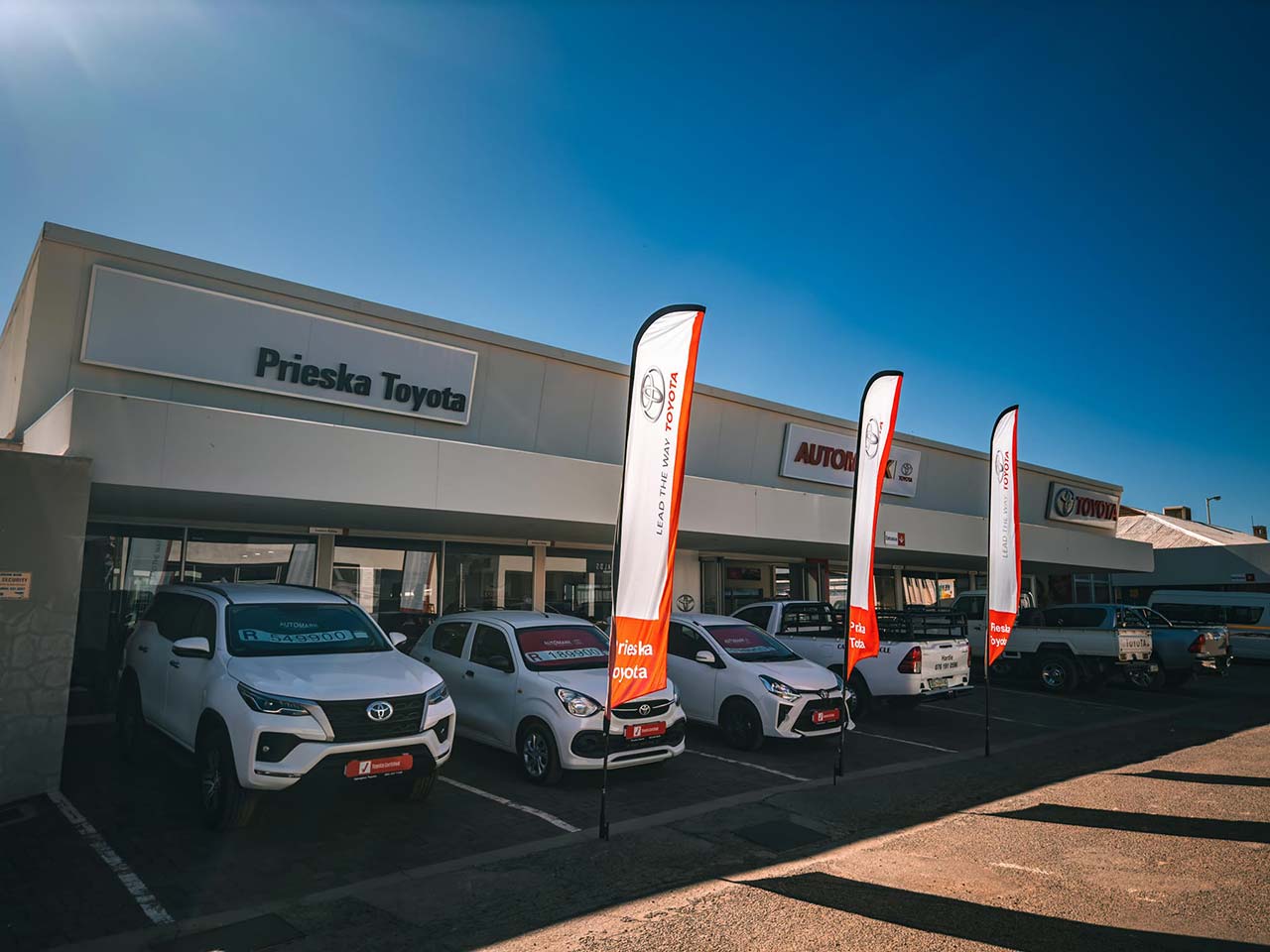 Prieska Toyota is 'n motorhandelaarskap van formaat. Totale kliëntetevredenheid is ons prioriteit. Kom besoek ons gerus en bewonder 'n reeks voertuie wat aan al jou behoeftes voldoen: uitnemendheid, lojaliteit en legendariese betroubaarheid, want by Prieska Toyota vind ons die mobiliteitsoplossing wat jou sak sal pas en boonop verwagting oortref. Ons bekwame tegnici bied flink diens om te verseker dat jou Toyota reg loop, altyd reg, soos net 'n Toyota kan!